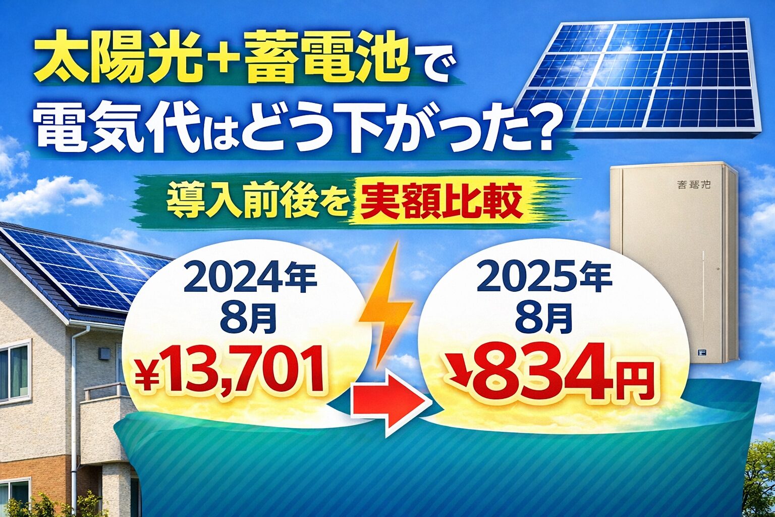 我が家が太陽光発電(6.36kW)と蓄電池(13.3kWh)を導入した前後の電気代を、